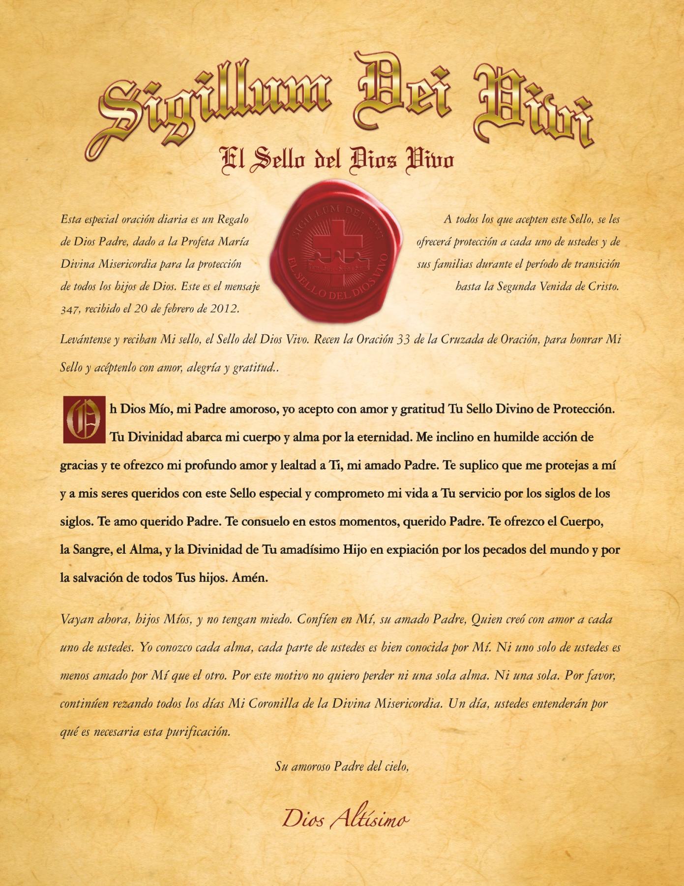 Oh Dios Mío, mi Padre amoroso, yo acepto con amor y gratitud Tu Sello Divino de Protección. Tu Divinidad abarca mi cuerpo y alma por la eternidad. Me inclino en humilde acción de gracias y te ofrezco mi profundo amor y lealtad a Ti, mi amado Padre. Te suplico que me protejas a mí y a mis seres queridos con este Sello especial y comprometo mi vida a Tu servicio por los siglos de los siglos. Te amo querido Padre. Te consuelo en estos momentos, querido Padre. Te ofrezco el Cuerpo, la Sangre, el Alma, y la Divinidad de Tu amadísimo Hijo en expiación por los pecados del mundo y por la salvación de todos Tus hijos. Amén.