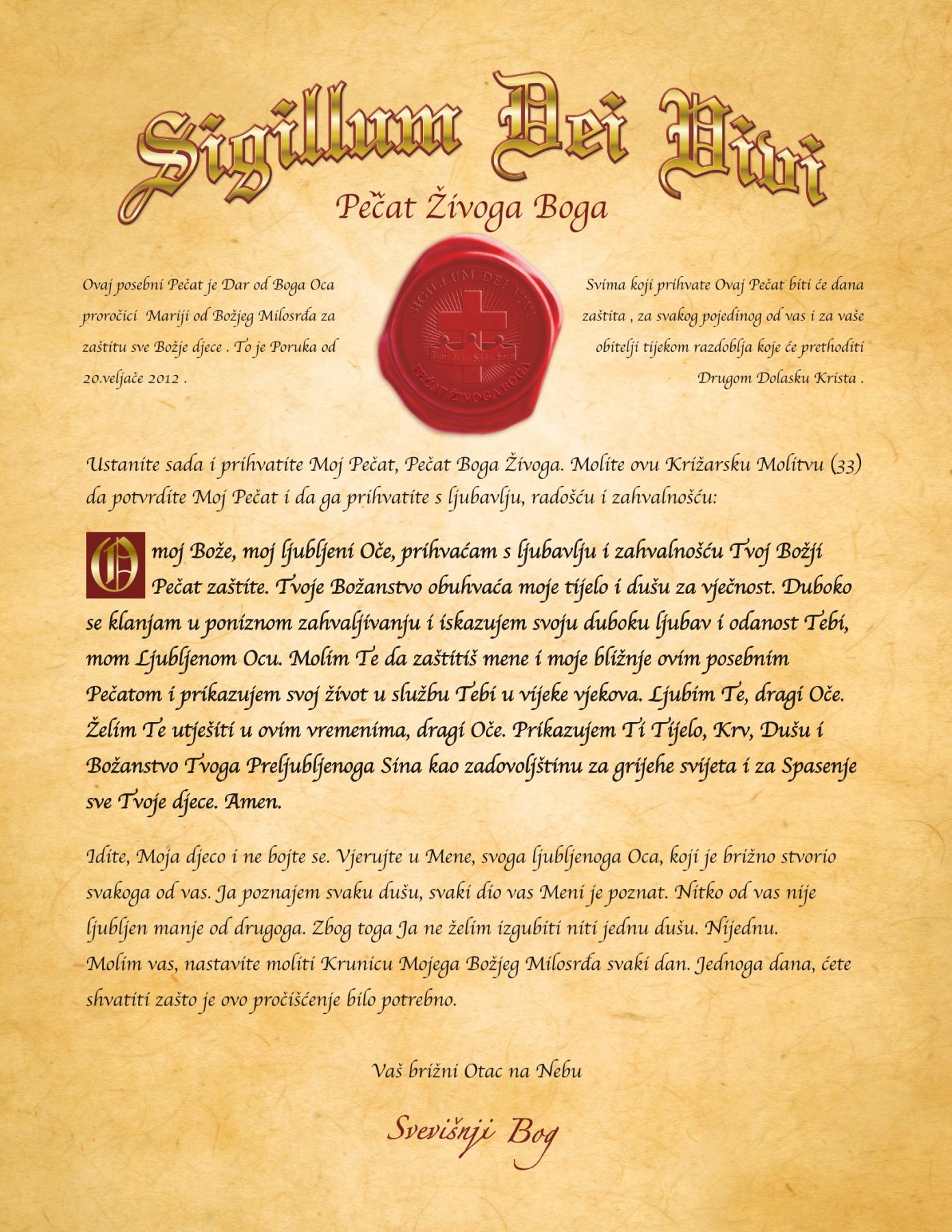 O moj Bože, moj ljubljeni Oče, prihvaćam s ljubavlju i zahvalnošću Tvoj Božji Pečat zaštite. Tvoje Božanstvo obuhvaća moje tijelo i dušu za vječnost. Duboko se klanjam u poniznom zahvaljivanju i iskazujem svoju duboku ljubav i odanost Tebi, mom Ljubljenom Ocu. Molim Te da zaštitiš mene i moje bližnje ovim posebnim Pečatom i prikazujem svoj život u službu Tebi u vijeke vjekova. Ljubim Te, dragi Oče. Želim Te utješiti u ovim vremenima, dragi Oče. Prikazujem Ti Tijelo, Krv, Dušu i Božanstvo Tvoga Preljubljenoga Sina kao zadovoljštinu za grijehe svijeta i za Spasenje sve Tvoje djece. Amen.