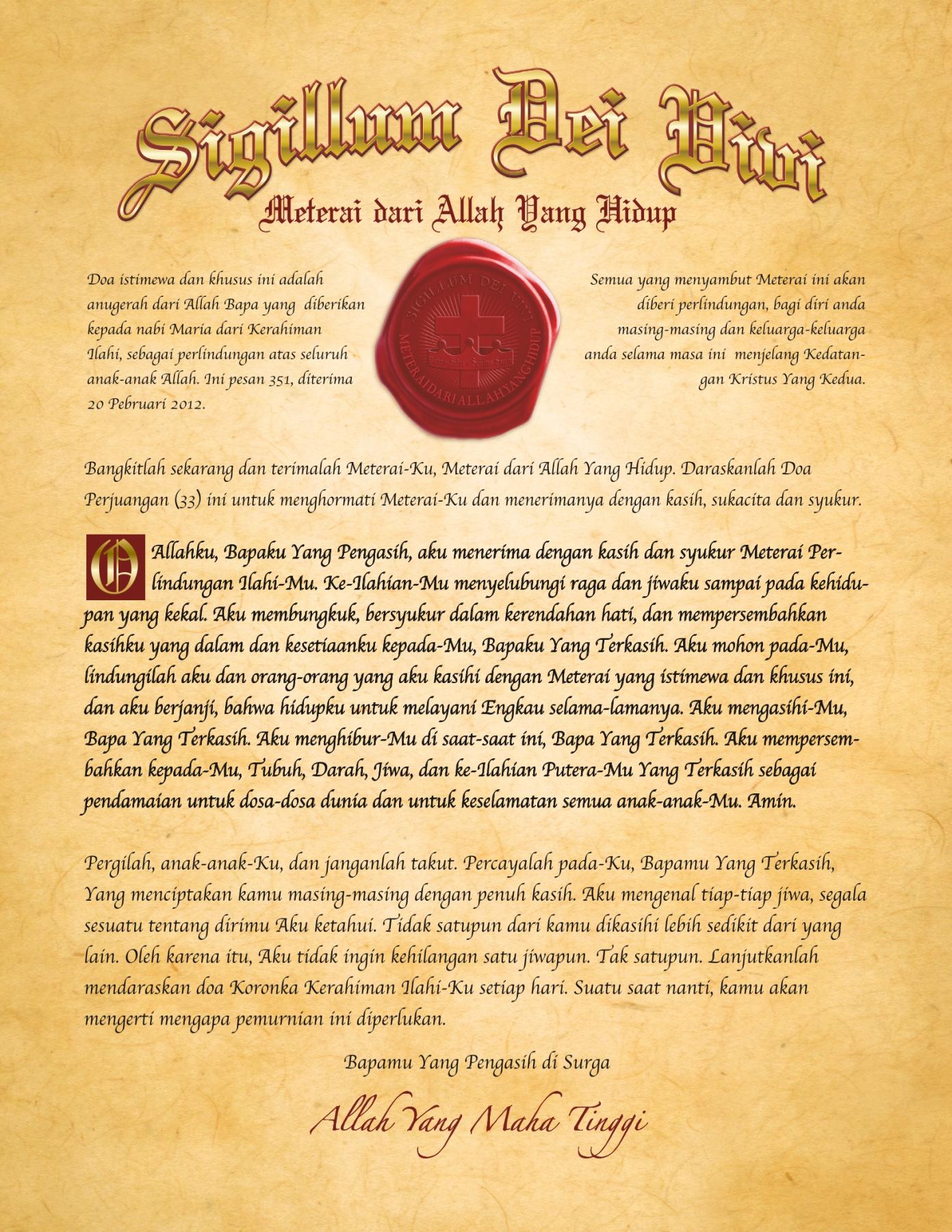 Bangkitlah sekarang dan terimalah Meterai-Ku, Meterai dari Allah Yang Hidup. Daraskanlah Doa Perjuangan (33) ini untuk menghormati Meterai-Ku dan menerimanya dengan kasih, sukacita dan syukur.