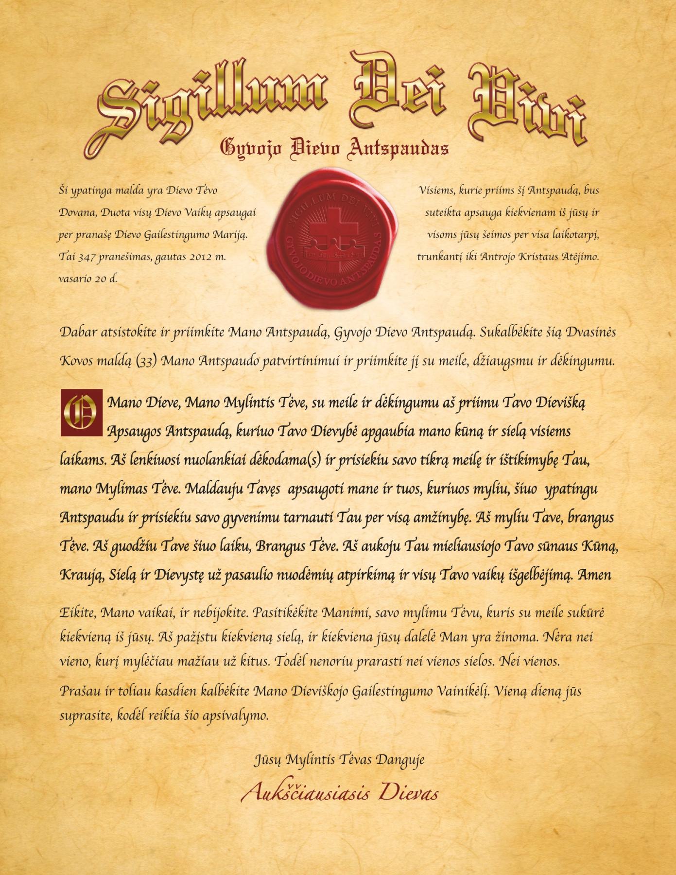 O mano Dieve, mano Mylintis Tėve, Su meile ir dėkingumu aš priimu Tavo Dieviškąjį Apsaugos Antspaudą. Tavo Dieviškumas apgaubia mano kūną ir sielą amžinybei. Aš lenkiuosi su nuolankiu dėkingumu ir aukoju savo gilią meilę ir ištikimybę Tau, mano mylimas Tėve. Aš maldauju Tave apsaugoti mane ir tuos, kuriuos myliu, šiuo ypatingu Antspaudu, ir aš pažadu savo gyvenimą Tavo tarnystei per amžių amžius. Aš myliu Tave, Mielasis Tėve. Aš guodžiu Tave šiais laikais, Mielasis Tėve. Aš aukoju Tau Tavo mylimojo Sūnaus Kūną, Kraują, Sielą ir Dieviškumą atsiteisti už pasaulio nuodėmes ir už visų Tavo vaikų išganymą. Amen.