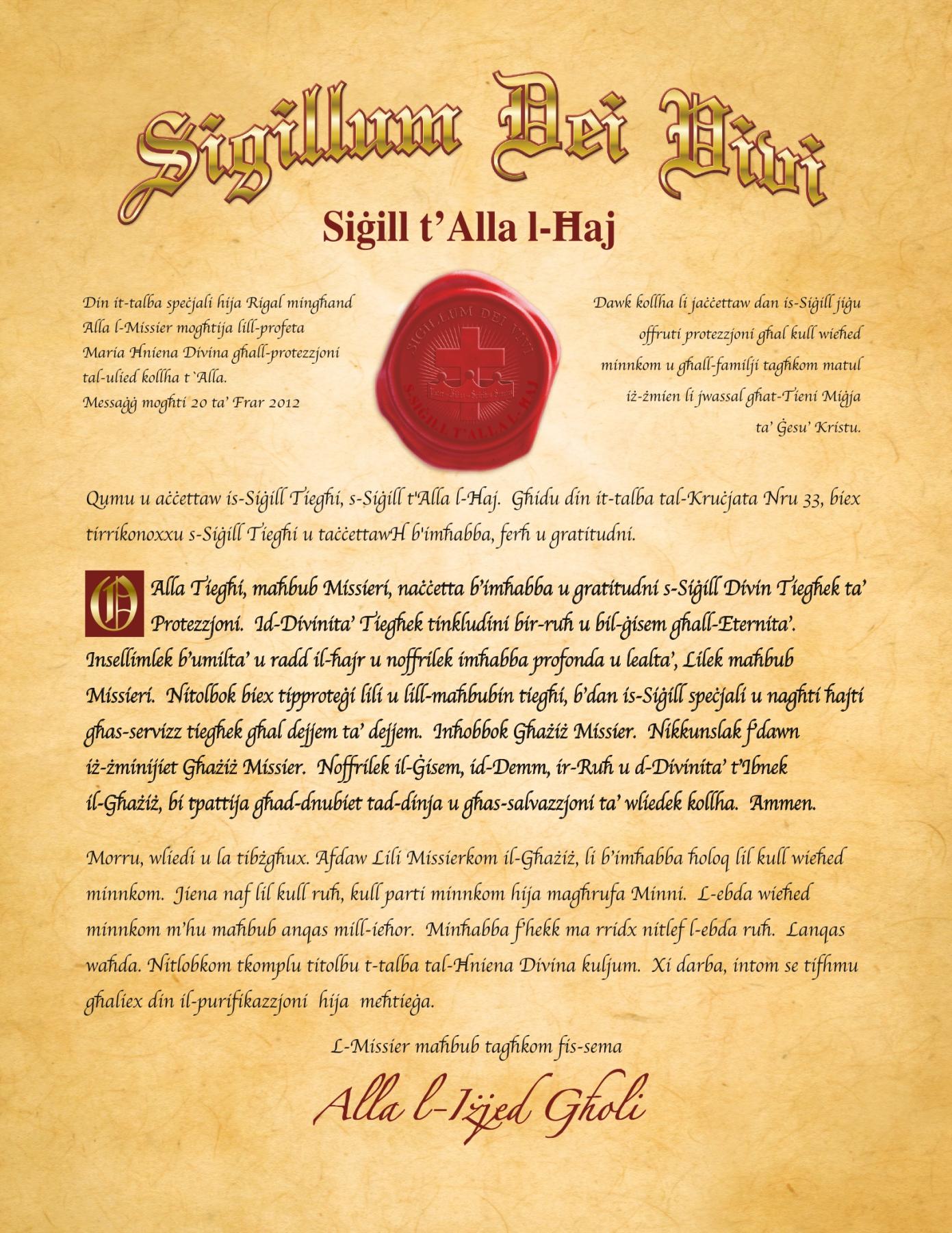 O Alla Tiegħi, maħbub Missieri, naċċetta b’imħabba u gratitudni s-Siġill Divin Tiegħek ta’ Protezzjoni. Id-Divinita’ Tiegħek tinkludini bir-ruħ u bil-ġisem għall-Eternita’. Insellimlek b’umilta’ u radd il-ħajr u noffrilek imħabba profonda u lealta’, Lilek maħbub Missieri. Nitolbok biex tipproteġi lili u lill-maħbubin tiegħi, b’dan is-Siġill speċjali u nagħti ħajti għas-servizz tiegħek għal dejjem ta’ dejjem. Inħobbok Għażiż Missier. Nikkunslak f’dawn iż-żminijiet Għażiż Missier. Noffrilek il-Ġisem, id-Demm, ir-Ruħ u d-Divinita’ t’Ibnek il-Għażiż, bi tpattija għad-dnubiet tad-dinja u għas-salvazzjoni ta’ wliedek kollha. Ammen.