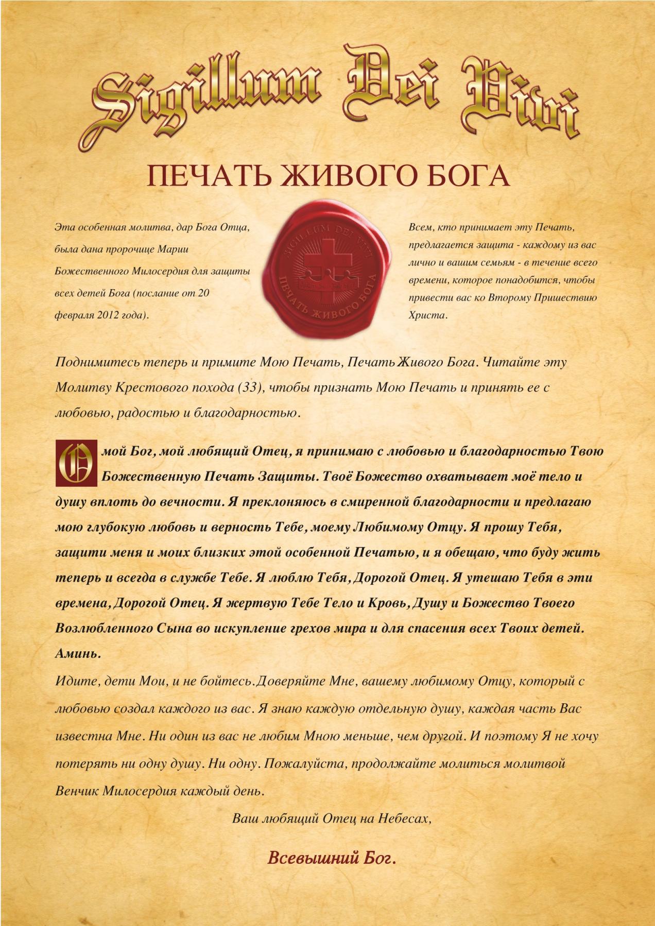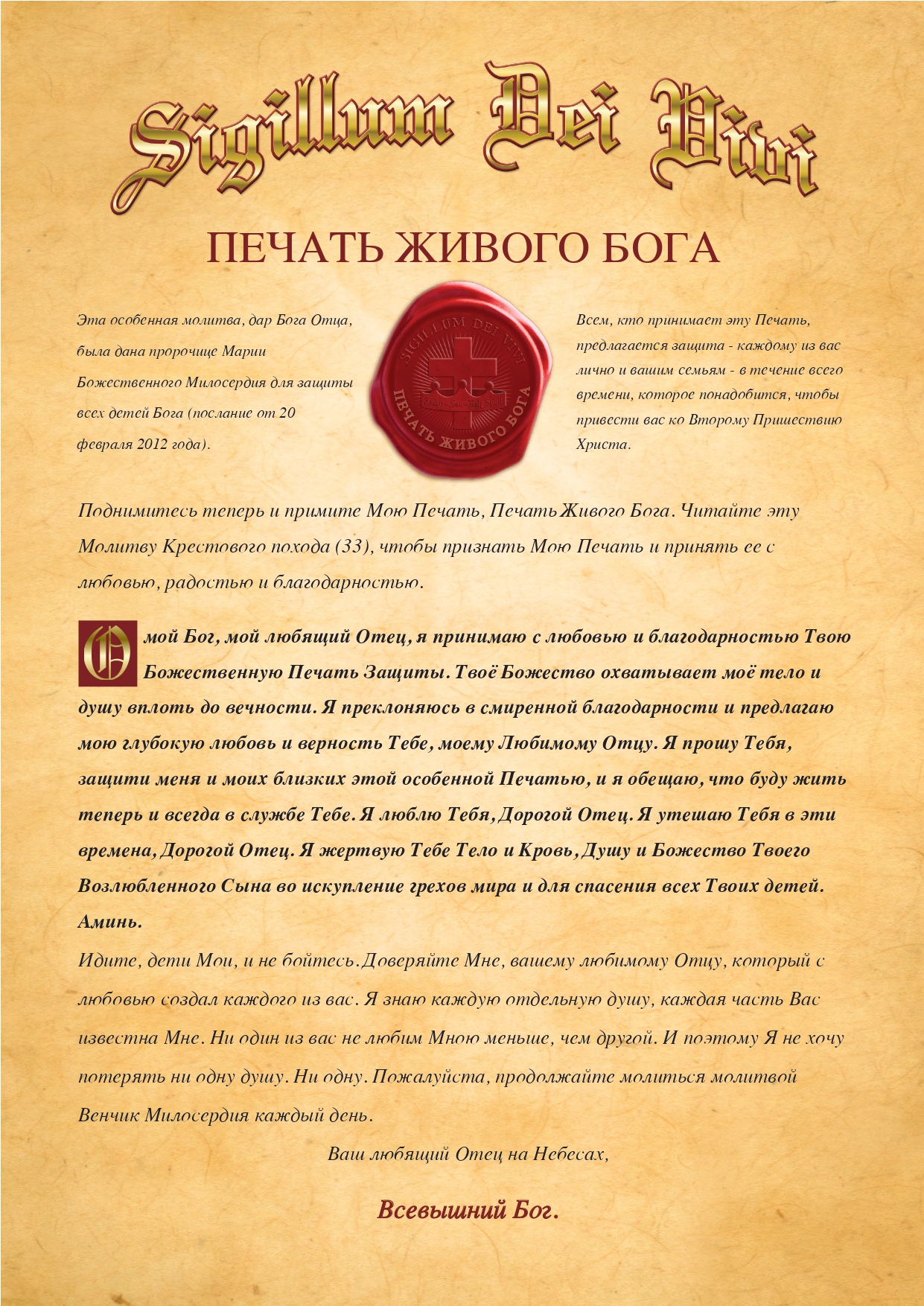 О мой Бог, мой любящий Отец, я принимаю с любовью и благодарностью Твою Божественную Печать Защиты. Твоё Божество охватывает моё тело и душу вплоть до вечности. Я преклоняюсь в смиренной благодарности и предлагаю мою глубокую любовь и верность Тебе, моему Любимому Отцу. Я прошу Тебя, защити меня и моих близких этой особенной Печатью, и я обещаю, что буду жить теперь и всегда в службе Тебе. Я люблю Тебя, Дорогой Отец. Я утешаю Тебя в эти времена, Дорогой Отец. Я жертвую Тебе Тело и Кровь, Душу и Божество Твоего Возлюбленного Сына во искупление грехов мира и для спасения всех Твоих детей. Аминь.