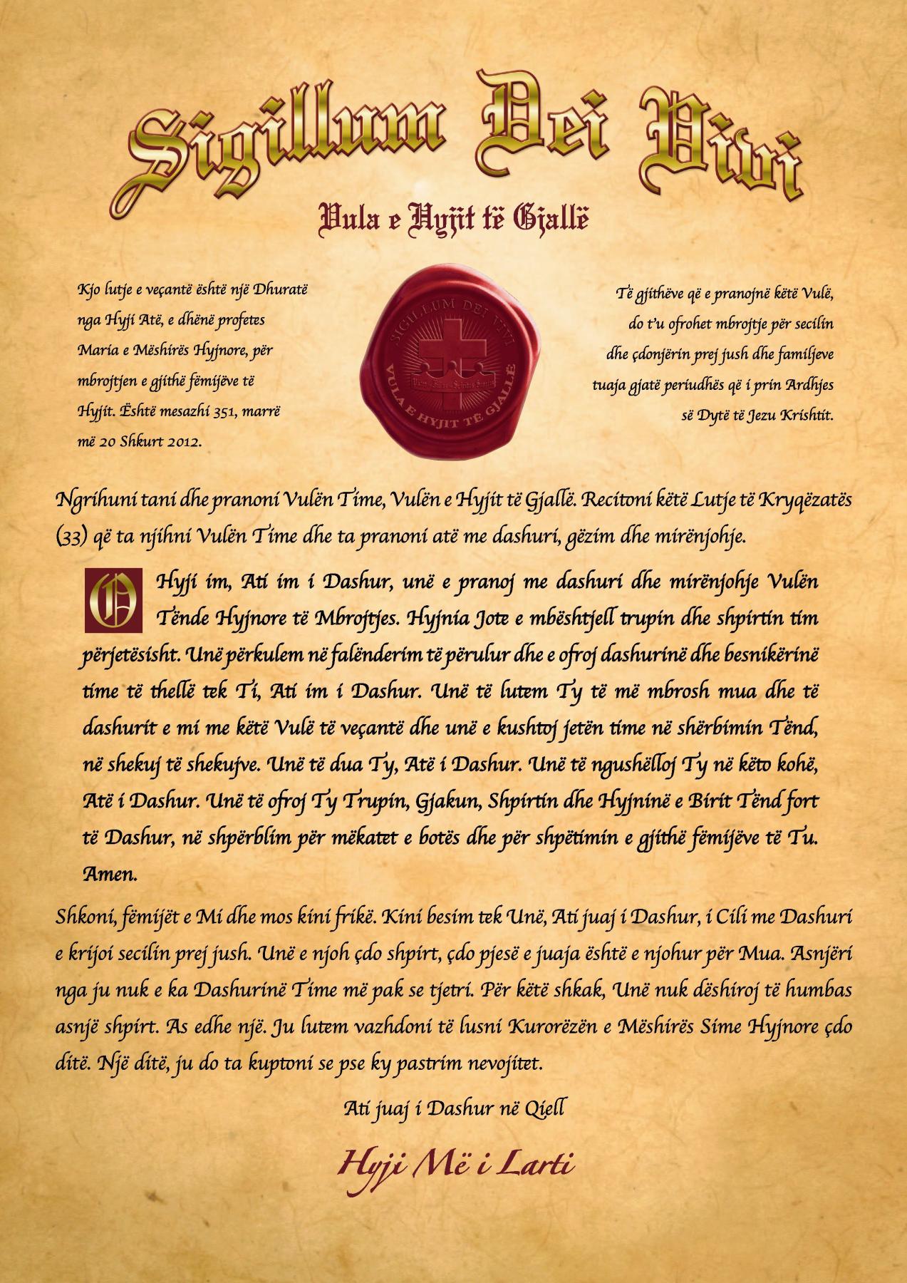 O Hyji im, Ati im i Dashur, unë e pranoj me dashuri dhe mirënjohje Vulën Tënde Hyjnore të Mbrojtjes. Hyjnia Jote e mbështjell trupin dhe shpirtin tim përjetësisht. Unë përkulem në falënderim të përulur dhe e ofroj dashurinë dhe besnikërinë time të thellë tek Ti, Ati im i Dashur. Unë të lutem Ty të më mbrosh mua dhe të dashurit e mi me këtë Vulë të veçantë dhe unë e kushtoj jetën time në shërbimin Tënd, në shekuj të shekujve. Unë të dua Ty, Atë i Dashur. Unë të ngushëlloj Ty në këto kohë, Atë i Dashur. Unë të ofroj Ty Trupin, Gjakun, Shpirtin dhe Hyjninë e Birit Tënd fort të Dashur, në shpërblim për mëkatet e botës dhe për shpëtimin e gjithë fëmijëve të Tu. Amen.