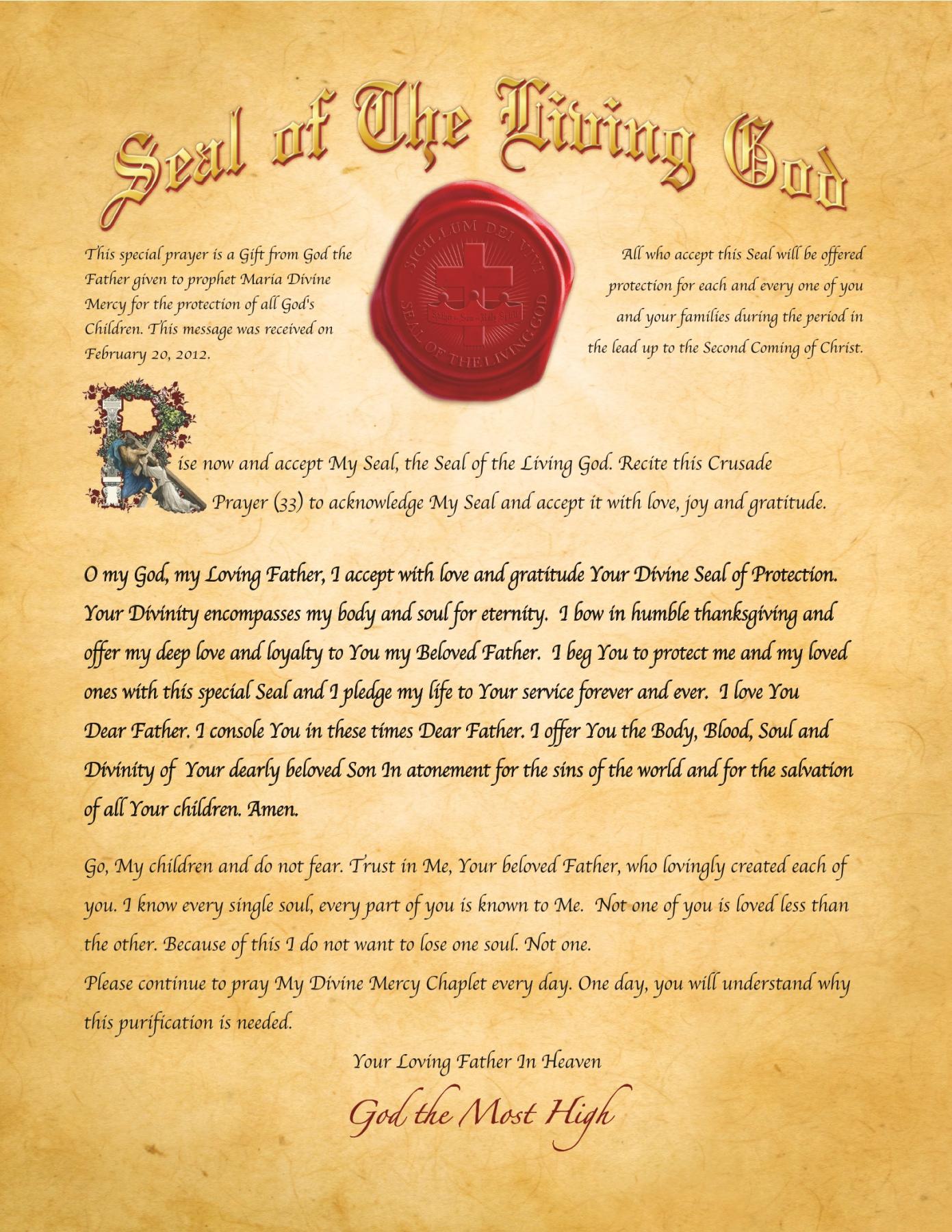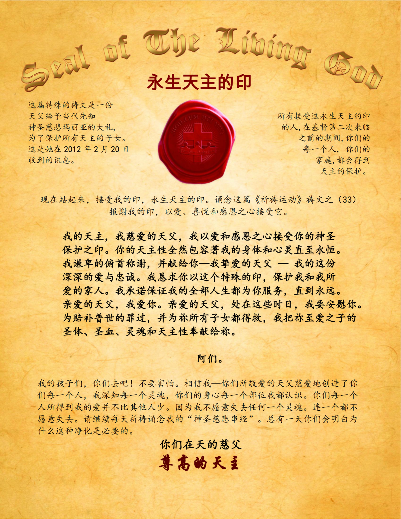 这篇特殊的祷文是一份天父给予当代先知神圣慈悲玛丽亚的大礼。为了保护所有天主的子女。这是她在2012年2月20日收到的讯息。